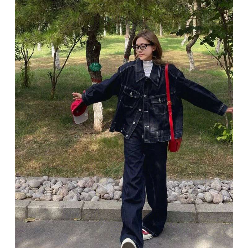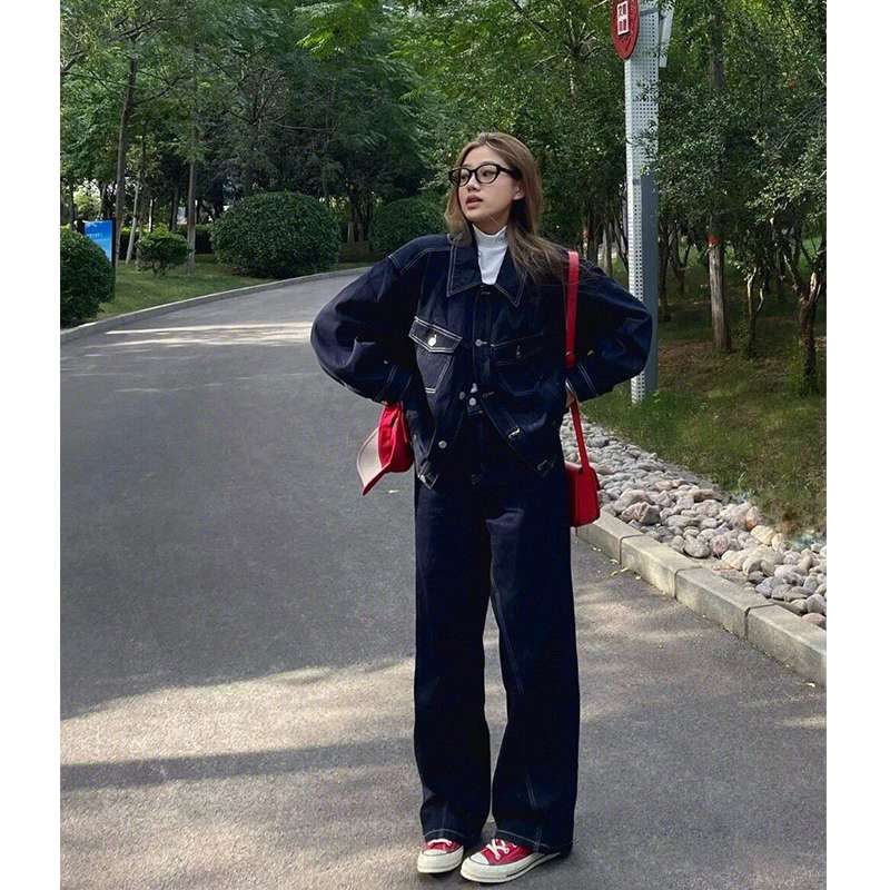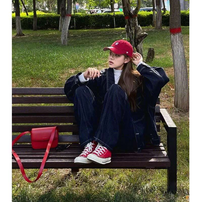 ゆったりとしたシルエットが特徴的なデニムセットアップ。深いインディゴカラーで、カジュアルながら洗練された印象。赤い小物やスニーカーとの相性が抜群で、都会的でスタイリッシュな着こなしが楽しめます。