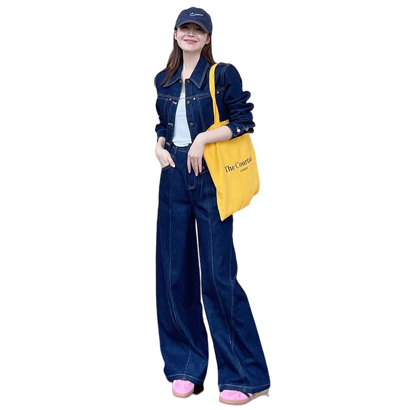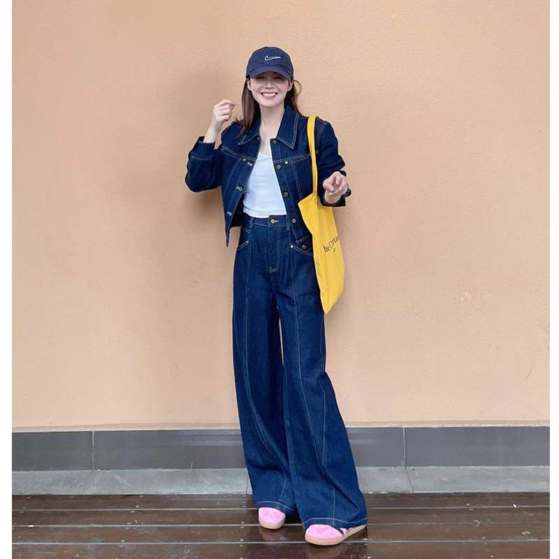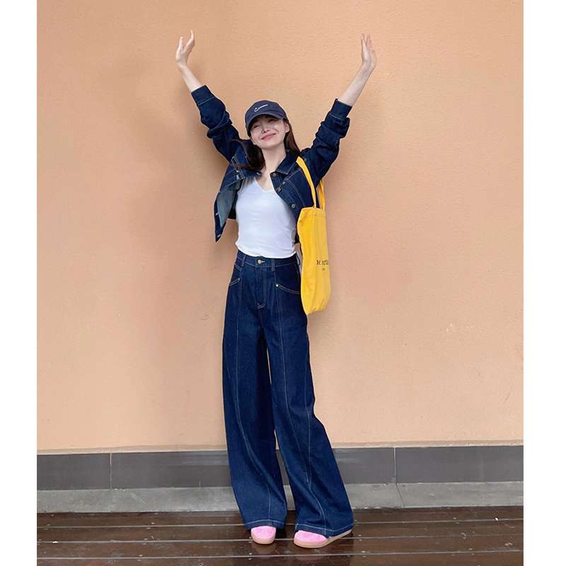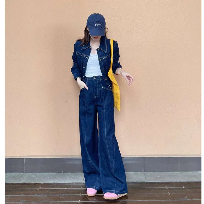 トレンディな深みのあるインディゴカラーのデニムジャケットとワイドパンツのセットアップ。カジュアルながら洗練された雰囲気を演出。白トップスと合わせてクリーンな印象に。黄色のバッグや帽子でアクセントを加えて、都会的なスタイルを完成させます。