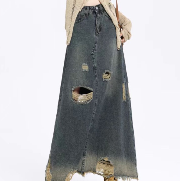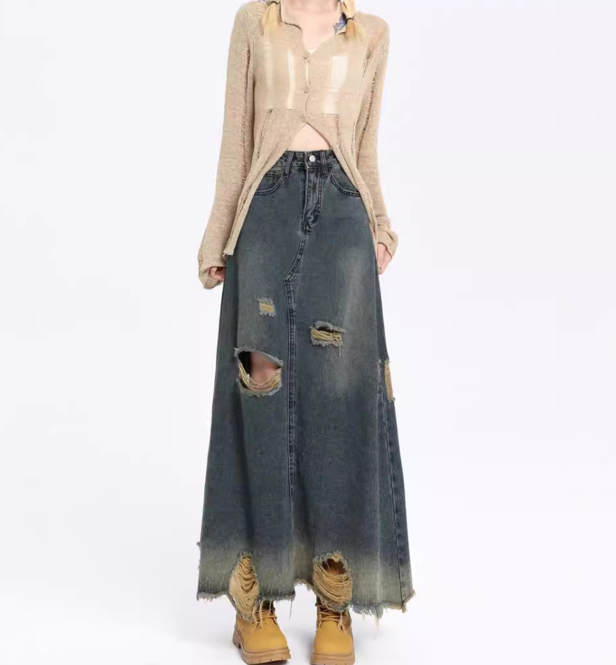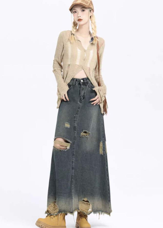 ハイウエストデザインが魅力のデニムロングスカート。細身のシルエットが美しいラインを描き、膝下から裾にかけてのダメージ加工とほつれがこなれた印象を与えます。カジュアルなコーディネートからきれいめスタイルまで、幅広く活躍する一着。デニム素材の心地よさとトレンド感を兼ね備えた、デイリーユースに最適なアイテムです。