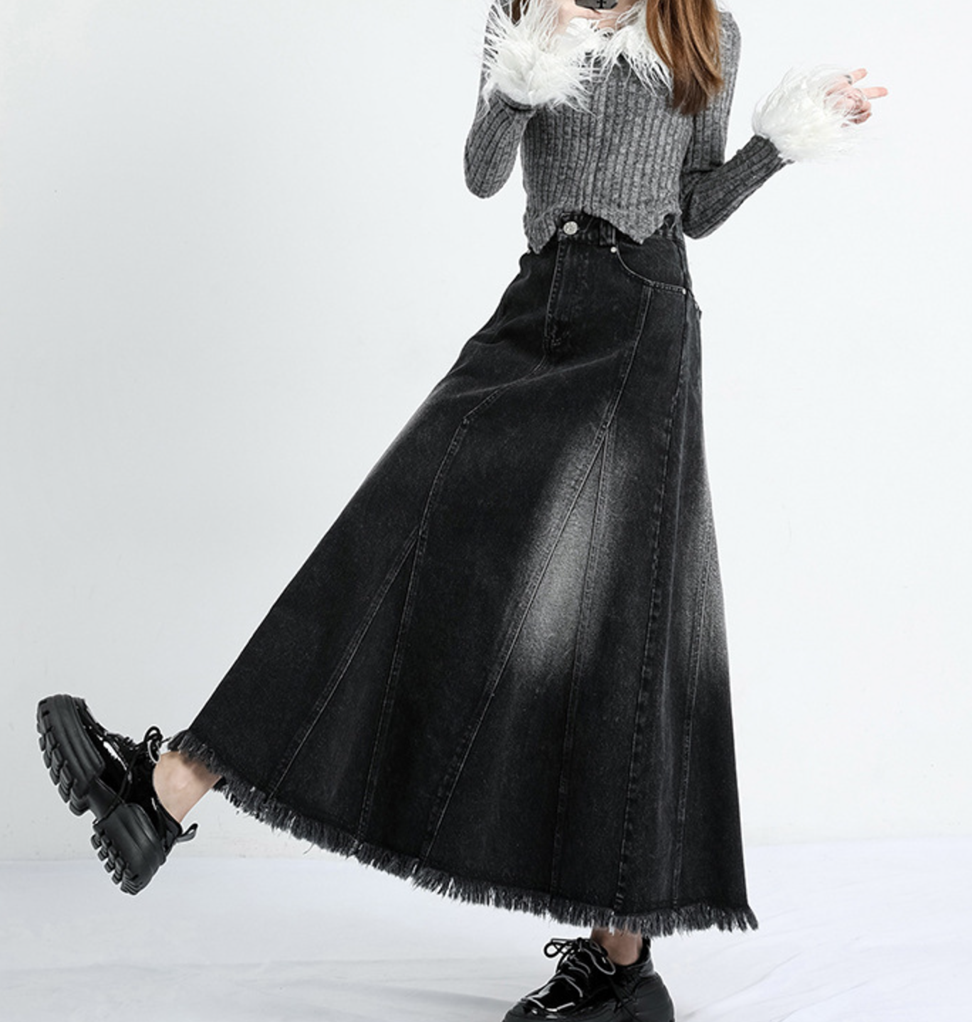 スカート裾のフリンジ加工が、カジュアルさとモダンな雰囲気を同時に演出する魅力的なデザインポイントです。