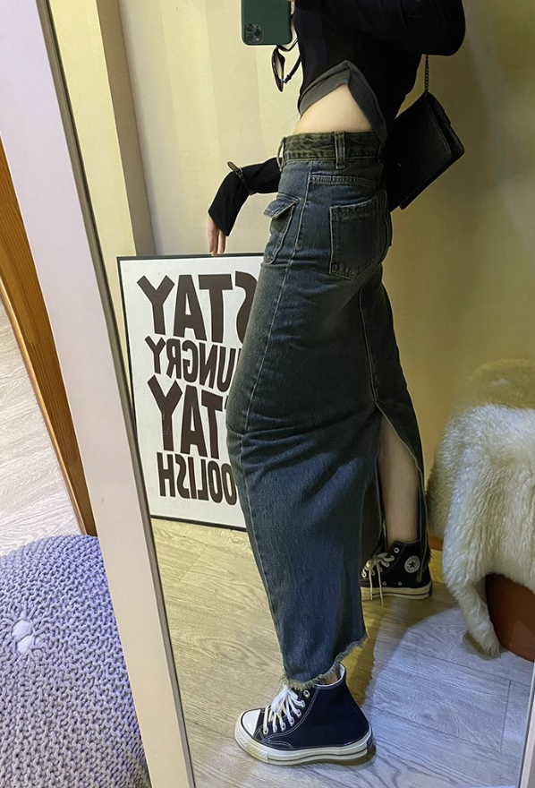 ゆったりとしたシルエットのロングデニムスカート。大きなポケットがデザインのポイントとなり、裾のフリンジ加工がカジュアルさを引き立てます。スニーカーと組み合わせることで、リラックスしたストリートスタイルが完成。さまざまなトップスとも相性抜群で、季節を問わず活躍する一着です。デニムの風合いが魅力的な、あなたのワードローブに欠かせないアイテム。