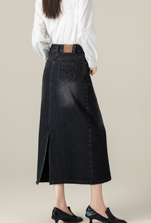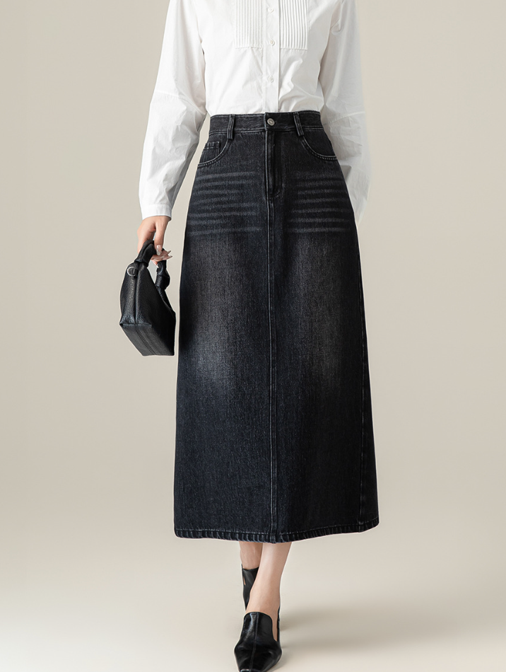 ハイウエストデザインの上品なデニムスカート。裾に向かって緩やかに広がるAラインシルエットで、脚長効果も期待できます。オフィスカジュアルからデイリーまで幅広く活躍する一枚です。
