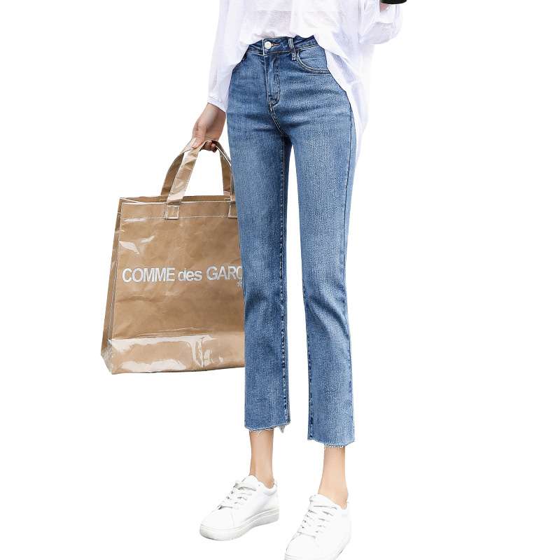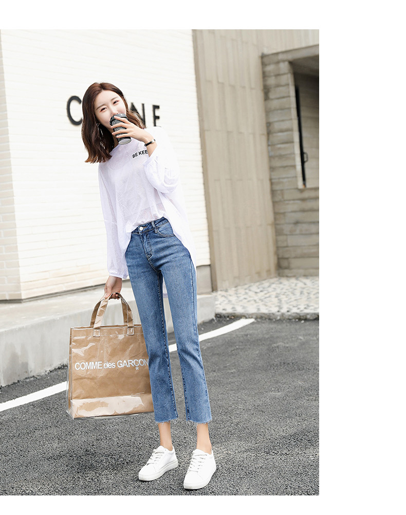 スタイリッシュなハイウエストデザインのクロップド丈ストレートジーンズ。クラシックなミッドブルーウォッシュで、カジュアルからセミフォーマルまで幅広いコーディネートに対応。裾のカットオフ加工がトレンド感を演出し、白スニーカーとの相性抜群です。