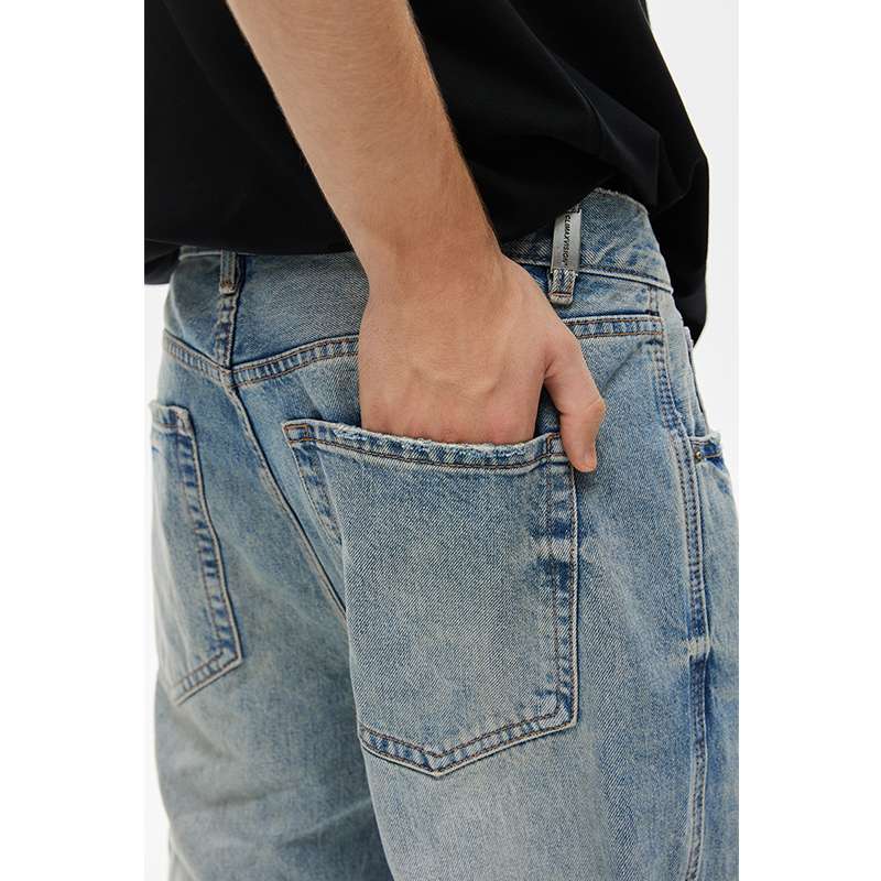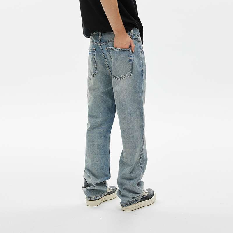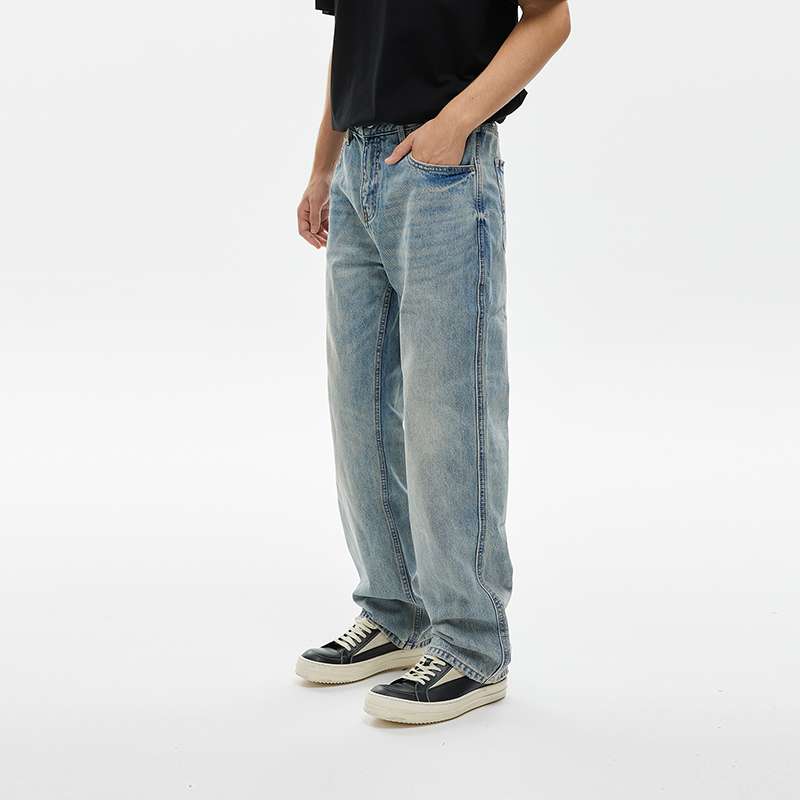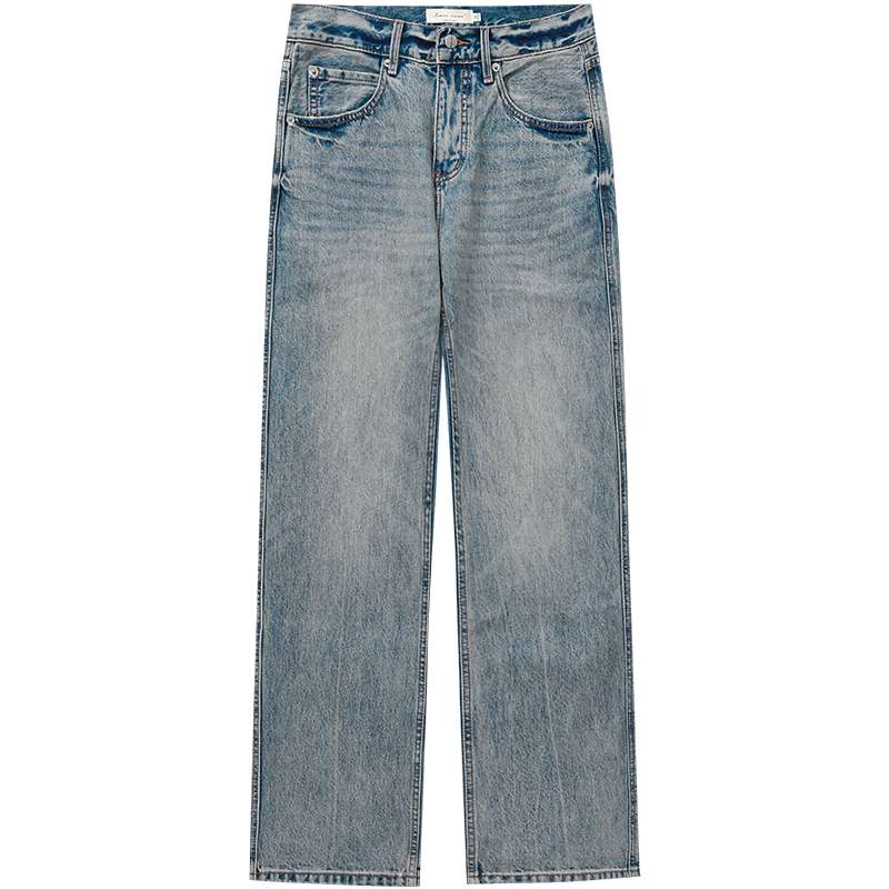 淡いブルーの風合いが特徴的なストレートジーンズ。リラックスフィットで快適な履き心地。ヴィンテージ感溢れる色落ち加工が、カジュアルからセミフォーマルまで幅広いスタイリングに対応。黒のTシャツやスニーカーとの相性抜群。