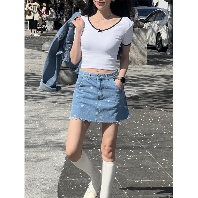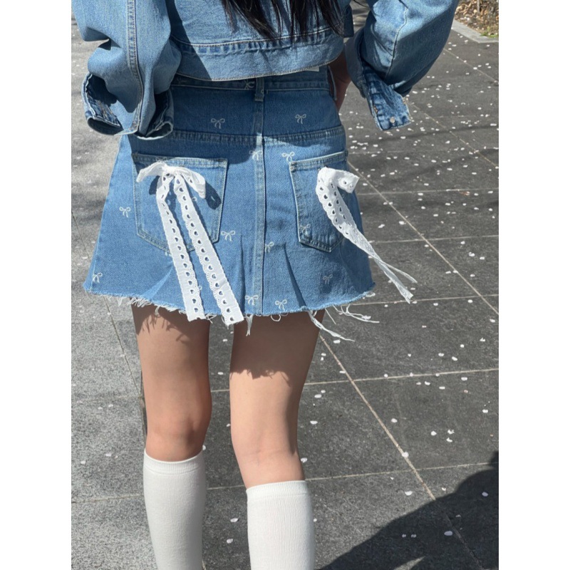 可愛いリボン刺繍が散りばめられたハイウエストデニムスカートです。