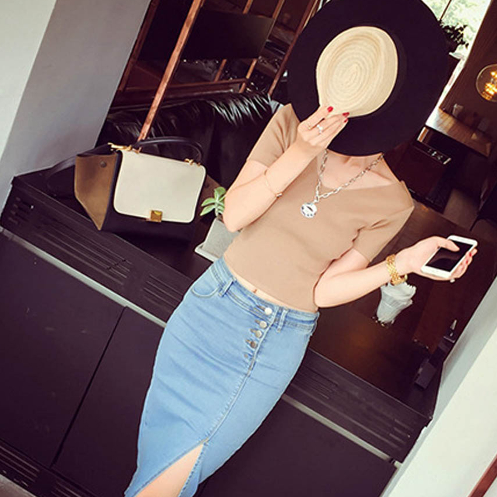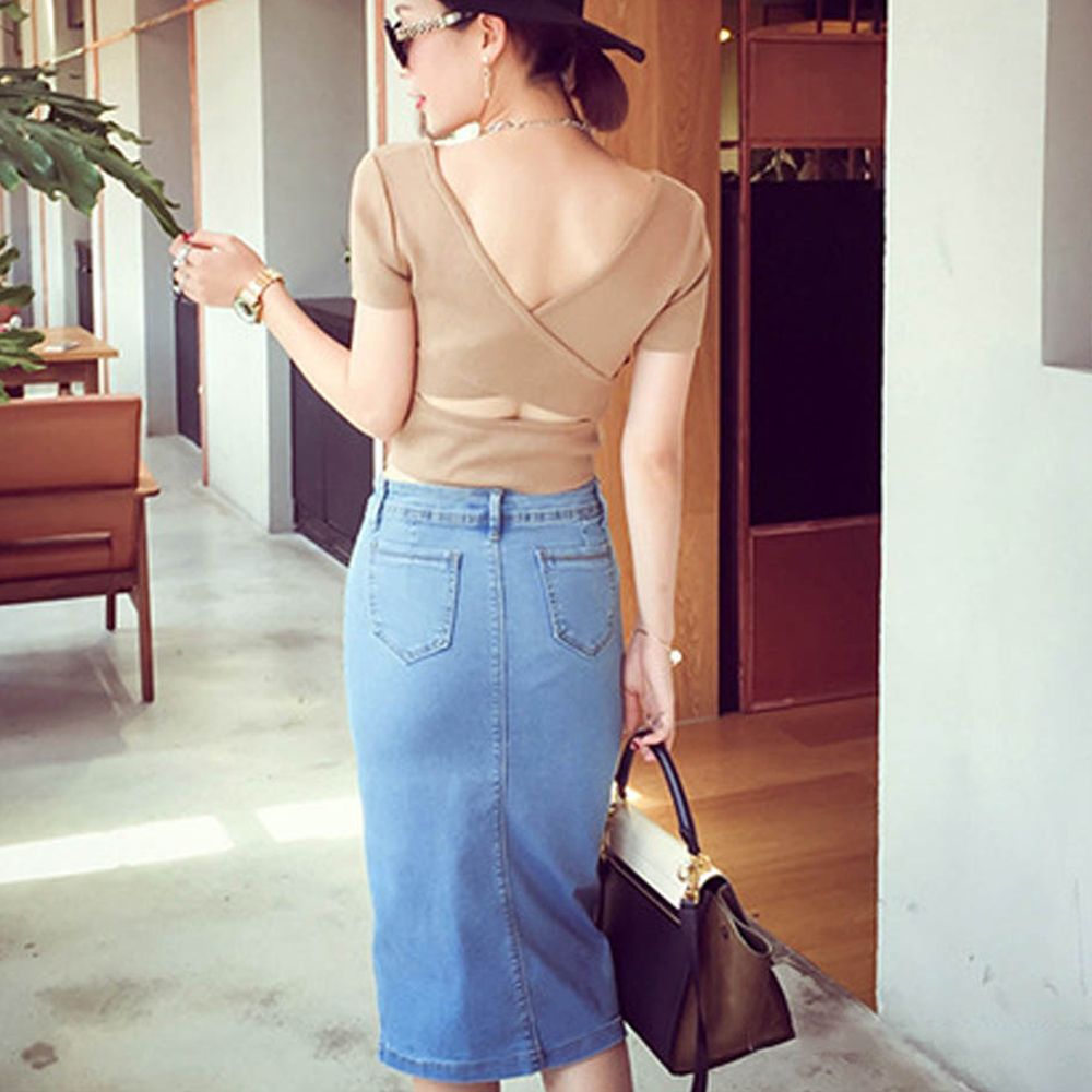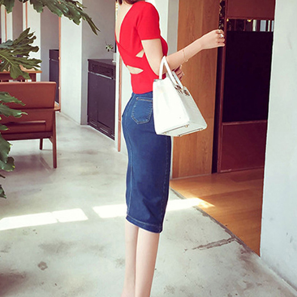 体のラインにフィットするストレッチ入りデニムスカートで美しいシルエットを演出。