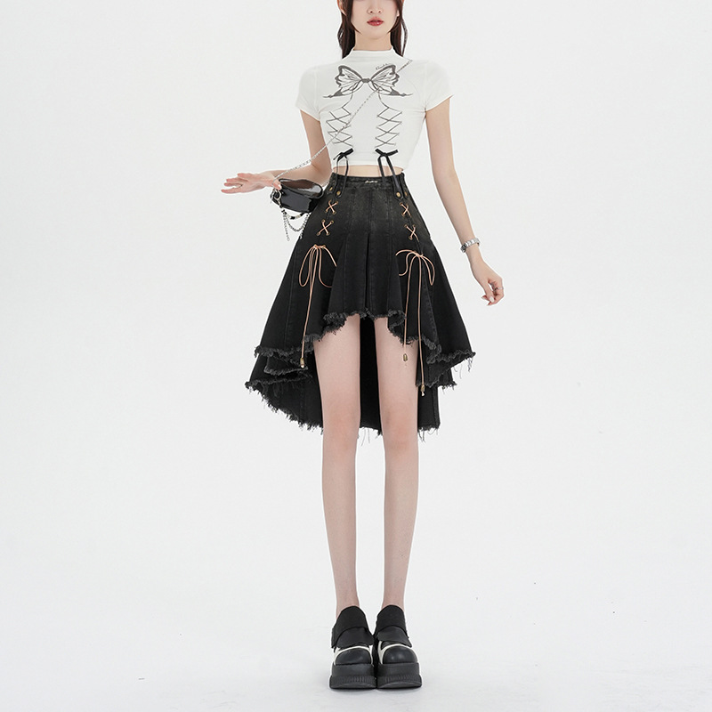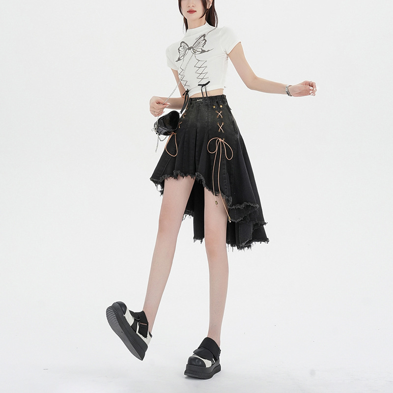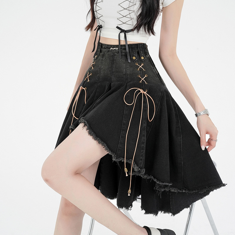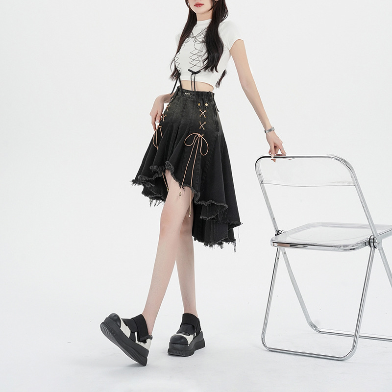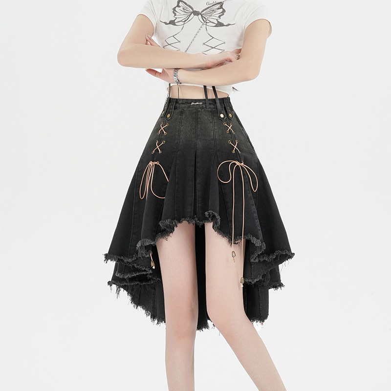 個性的なデザインが目を引くハイウエストのデニムスカートです。
