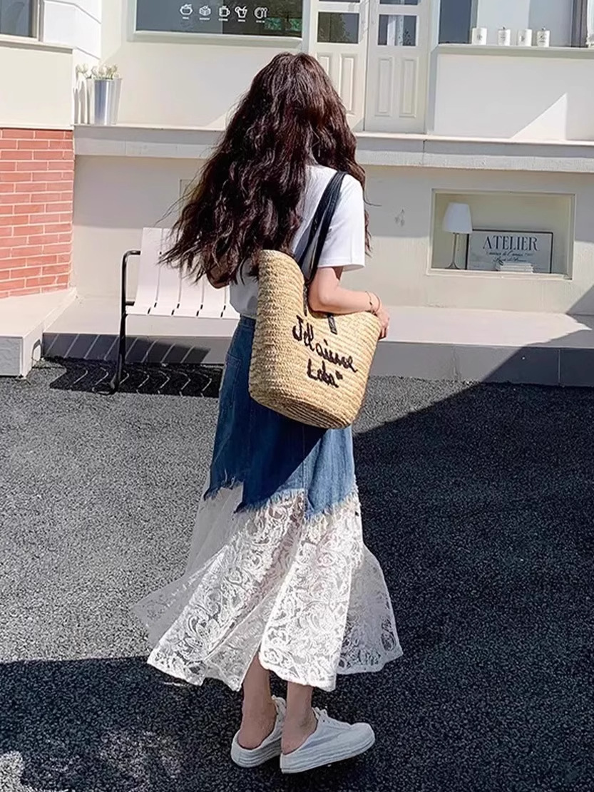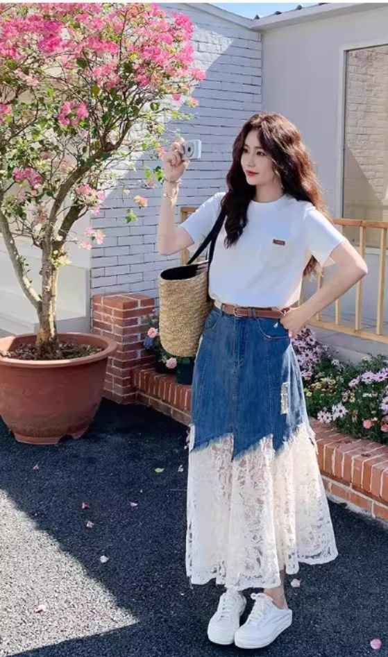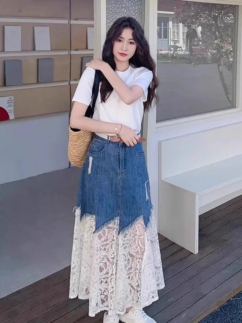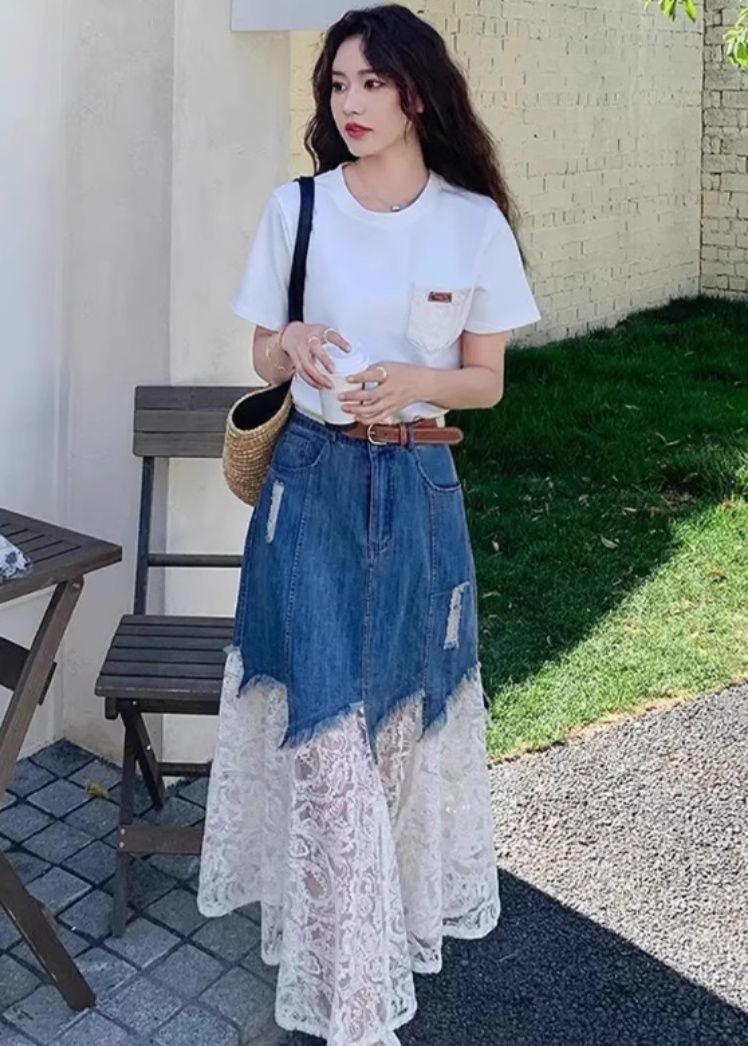 デニム素材とレースを組み合わせた個性的なデザインのロングスカートです。