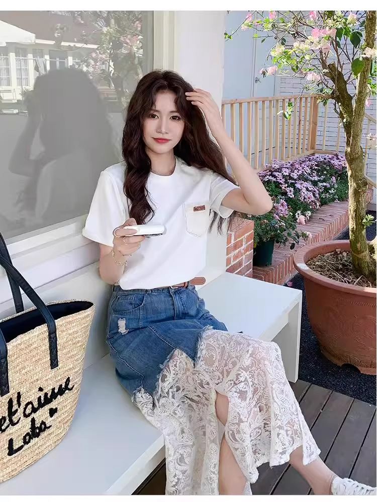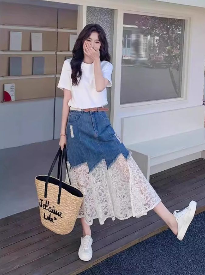 夏のおでかけにぴったりのデニムスカートで、涼しげなレース部分が軽やかな印象を与えてくれます。