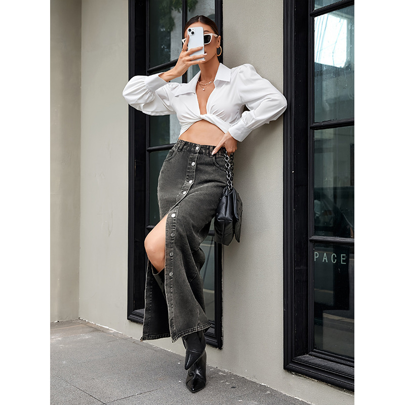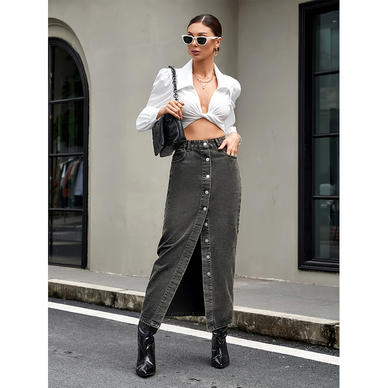 フロントに並んだボタンが印象的なデニムスカートです。