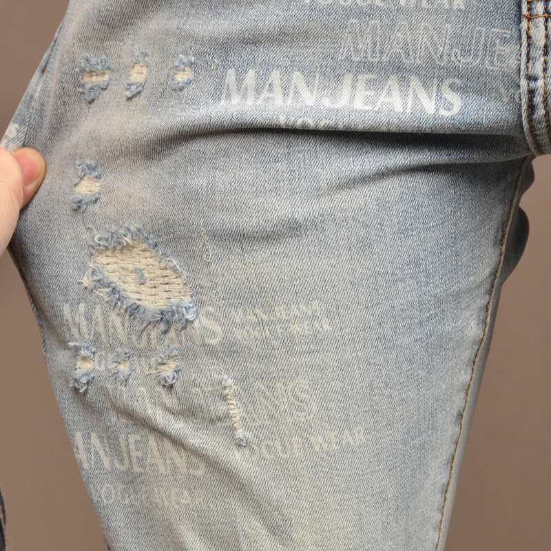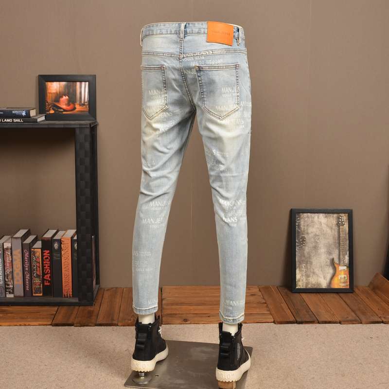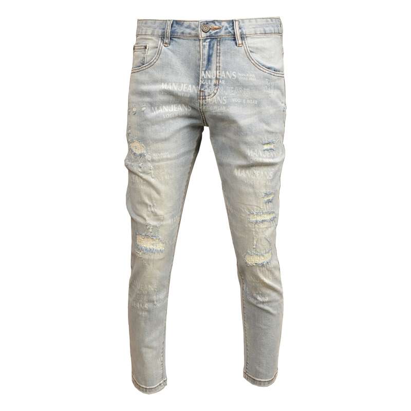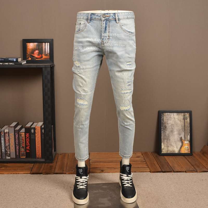 軽いウォッシュ加工とダメージ加工が施された、トレンディなスキニージーンズ。淡いブルーの色合いと細身のシルエットが特徴。カジュアルからセミフォーマルまで幅広いスタイリングに対応。黒のスニーカーと合わせて、スタイリッシュな着こなしを演出。