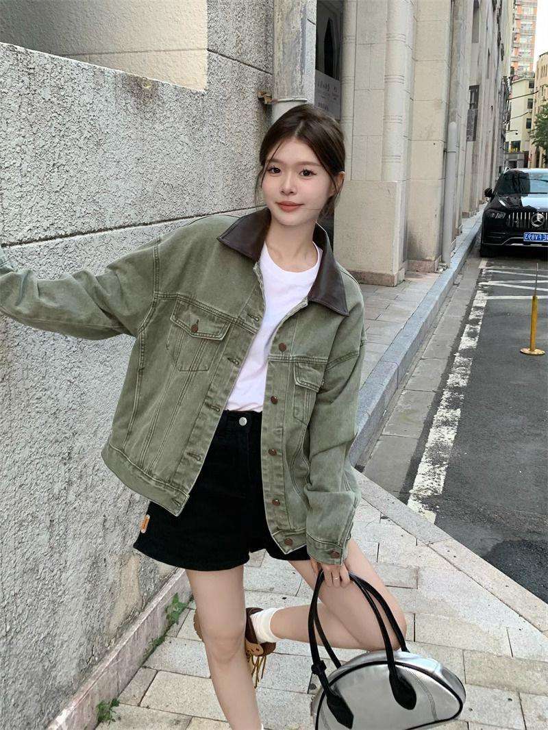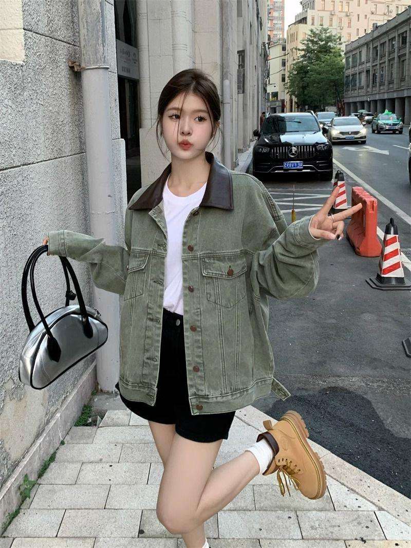 柔らかな風合いのオーバーサイズデニムジャケット。カーキ色が特徴的で、カジュアルながら都会的な雰囲気を演出。シンプルな白Tシャツや黒のボトムスとの相性抜群で、デイリーユースに最適なアイテムです。