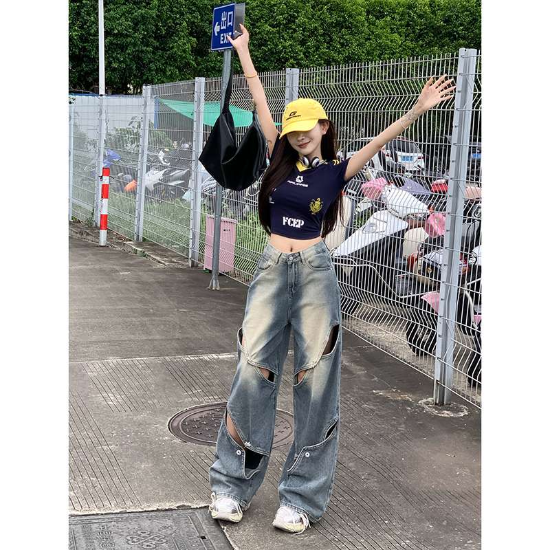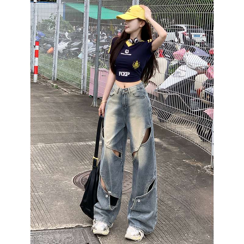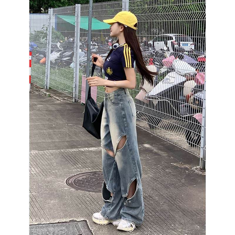 大胆なカットアウトデザインが特徴的なワイドレッグジーンズ。ヴィンテージ風の色落ち加工と相まって、個性的でストリートファッションにぴったり。ハイウエストで脚長効果も抜群。カジュアルからセミフォーマルまで幅広く活躍する一本。