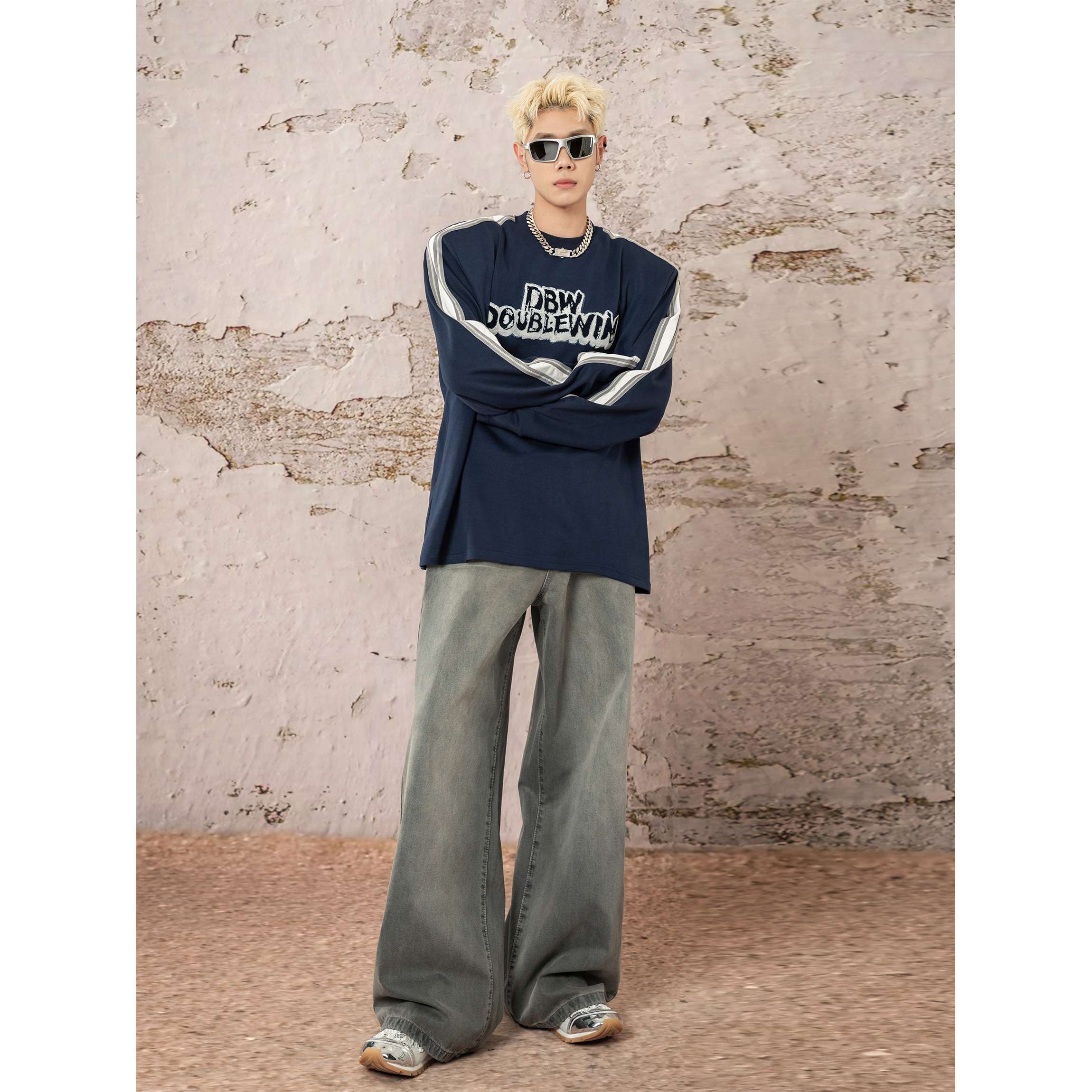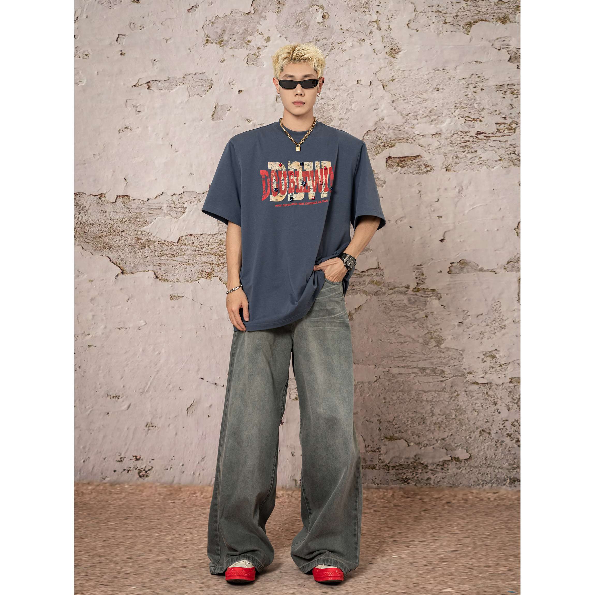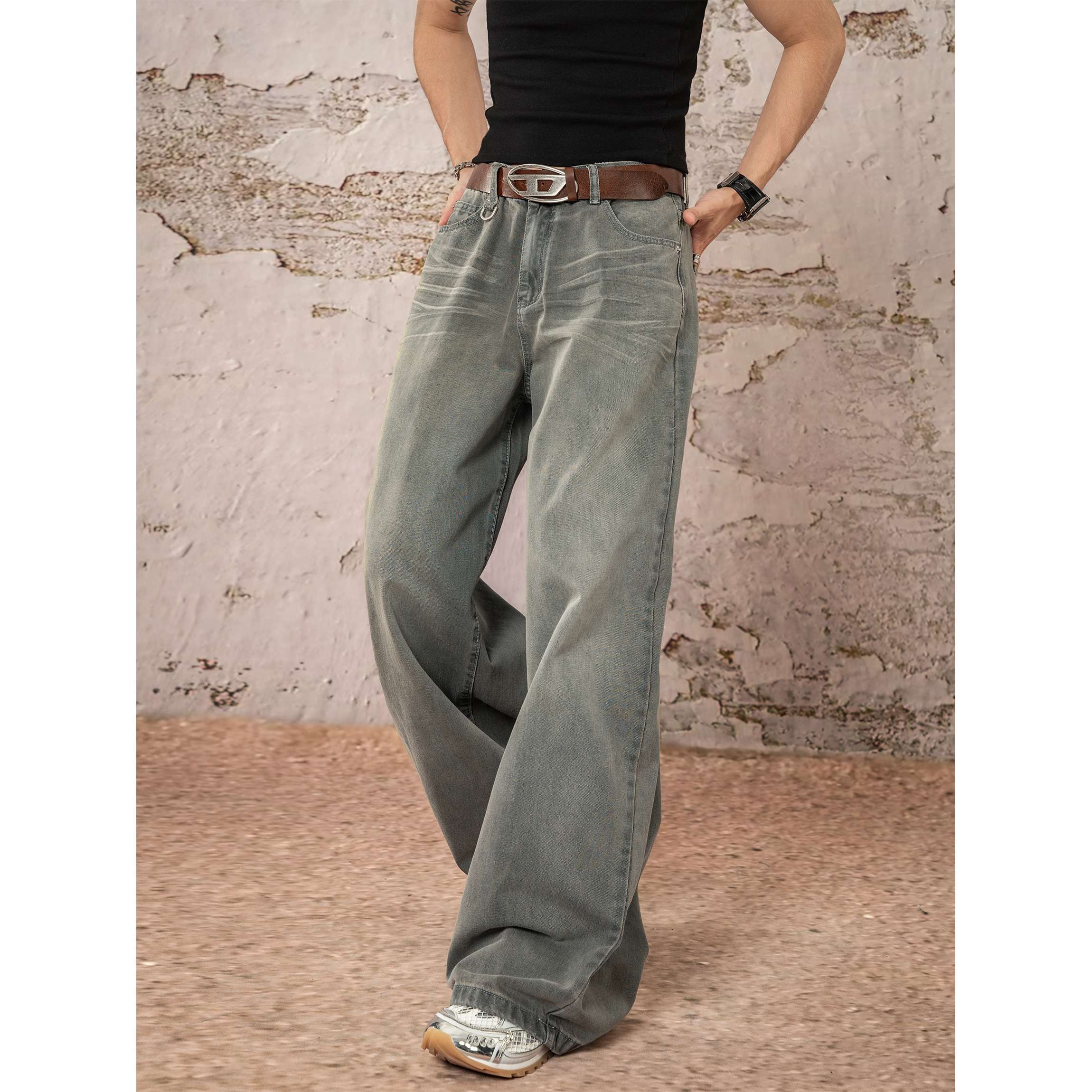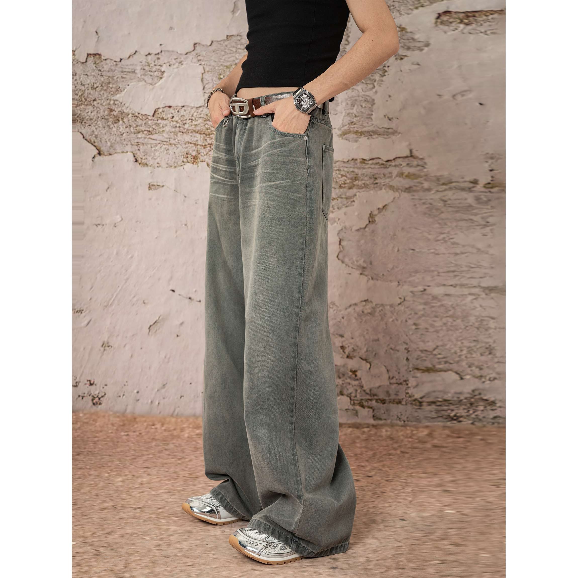 90年代風のオーバーサイズデザインが特徴的なワイドデニム。グリーンがかったヴィンテージウォッシュ加工で、ユニークな風合いを演出。裾が広がったシルエットで、カジュアルからストリートスタイルまで幅広く活躍する一本。