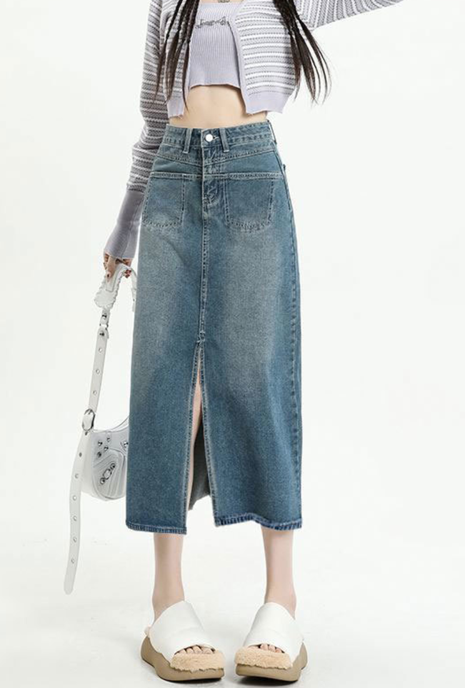 トレンド感満載のミディ丈デニムスリットスカート。フロントスリットが施されており、動きやすさとスタイリッシュさを両立。ヴィンテージ風の色落ち加工が魅力を引き立て、ハイウエストデザインでスタイルアップを実現。カジュアルなTシャツからフェミニンなブラウスまで、幅広いコーディネートに対応する万能アイテム。デニムスカートの新定番として、クローゼットに加えたい一着。