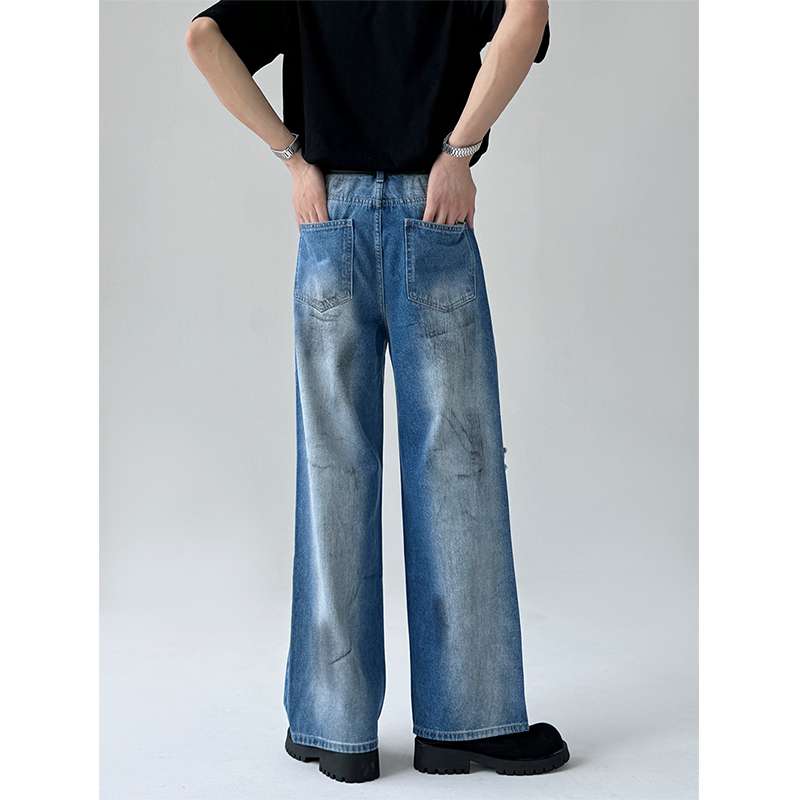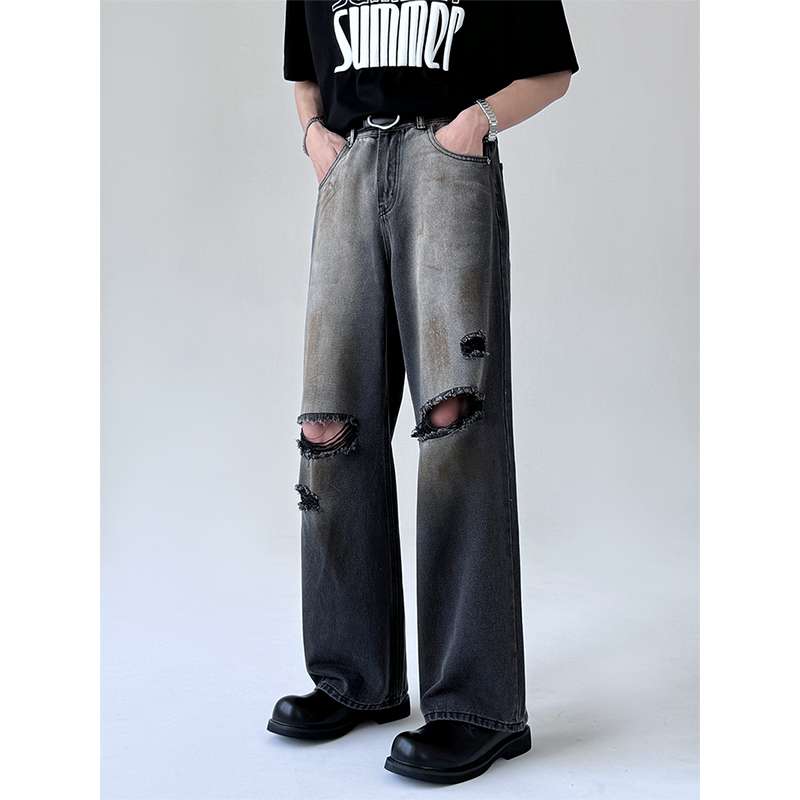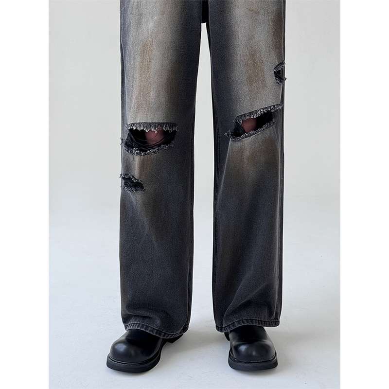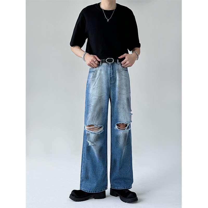 トレンドのワイドシルエットと膝のダメージ加工が特徴的なデニムパンツ。ハイウエストデザインで脚長効果抜群。カジュアルからストリートまで幅広いスタイリングに対応。ゆったりとした履き心地で快適な一本。