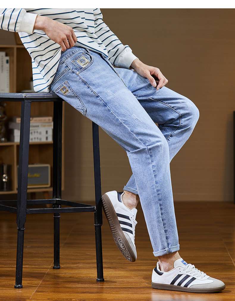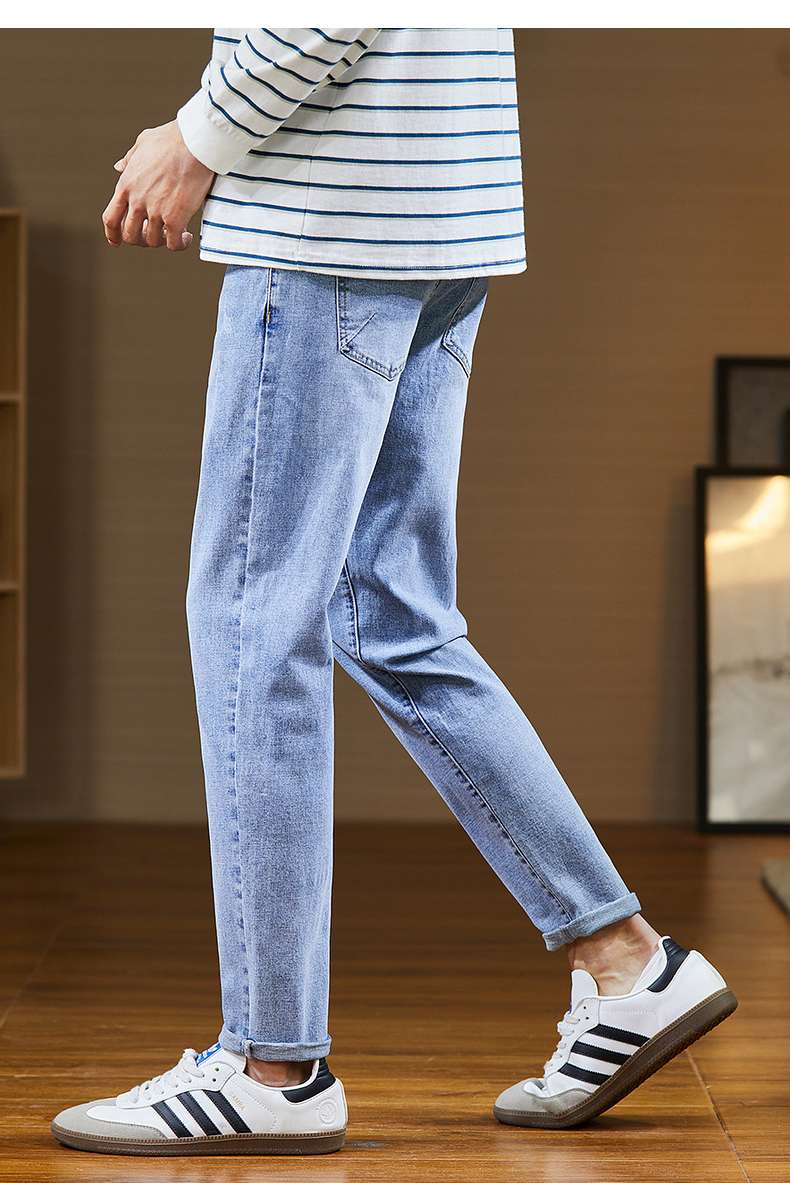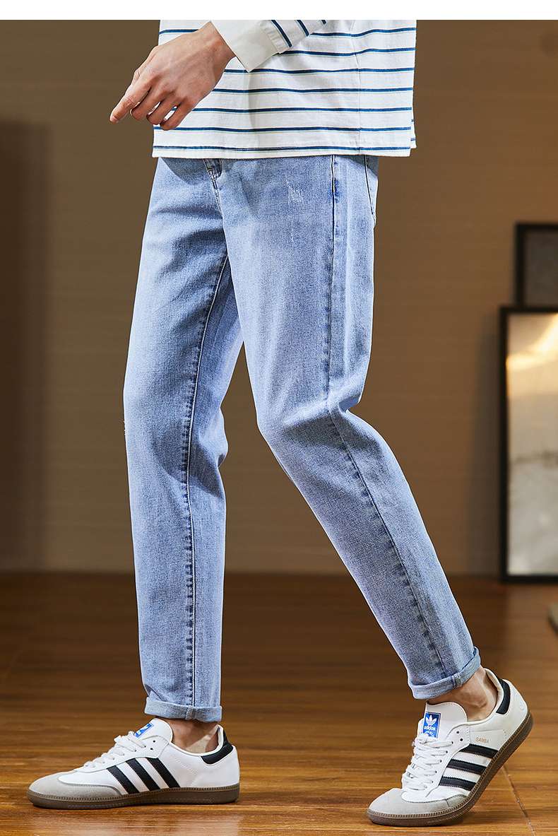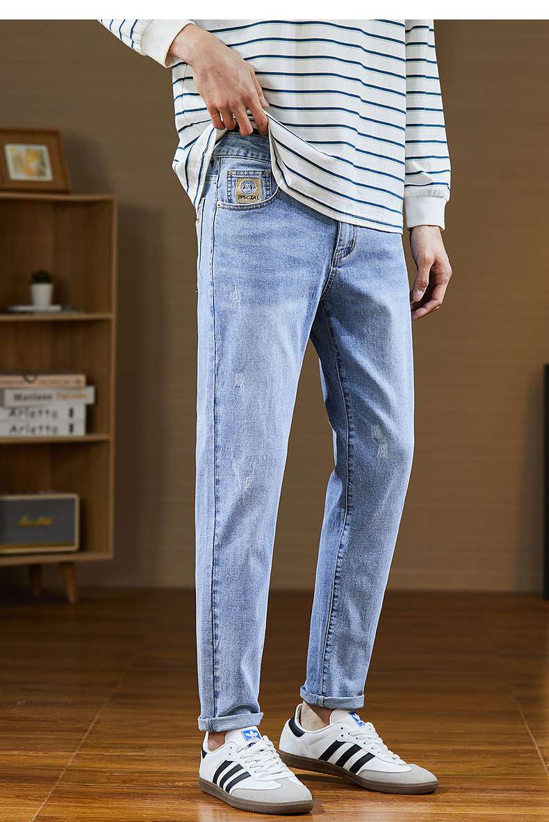 ライトブルーのウォッシュがかったストレートジーンズ。腰回りにゆとりを持たせつつ、裾に向かってやや細くなるテーパードシルエット。カジュアルからセミフォーマルまで幅広く活躍する アイテム。折り返し可能な裾デザイン。